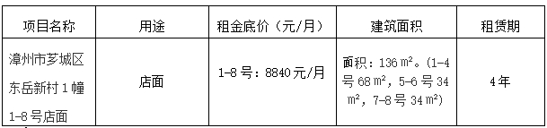 漳州市東岳新村1幢1-8號店面承租人?,F(xiàn)將具體事項(xiàng)公告如下:一、租賃標(biāo)的物(標(biāo)的物以現(xiàn)狀為準(zhǔn)):